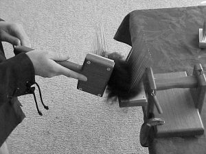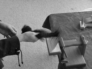 mvc-006fThe fibre is then transferred to the second comb by combing the wool at a ninety-degree angle. Comb from right to left and from left to right—slightly tilt the comb towards the floor so the fibre on the stationary comb stays down on the tines.